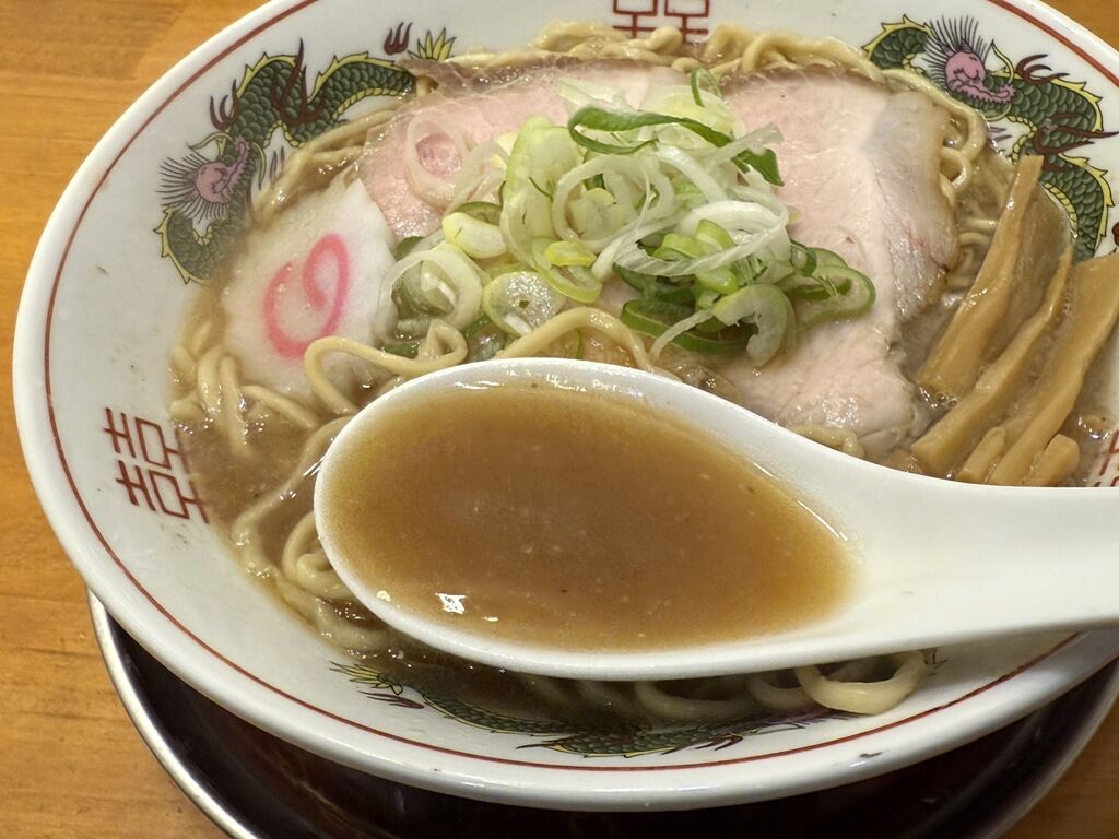 具はチャーシュー2枚、めんま、なると、小口切りねぎ。チャーシューは吊るし焼きでしょうか。スモーキーな香ばしい風味が美味。なるとは正しくのの字に配置。