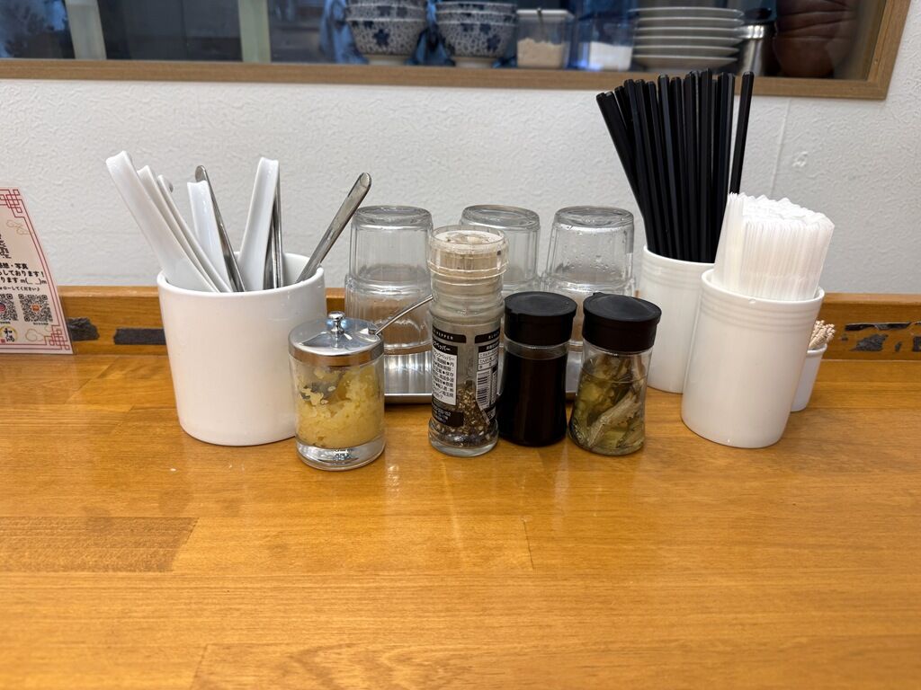 BGMはねぶた祭りの祭囃子。箸は洗い箸でサスティナブルに配慮。卓上調味料はおろしニンニク、ブラックペッパー、醤油?、煮干酢。