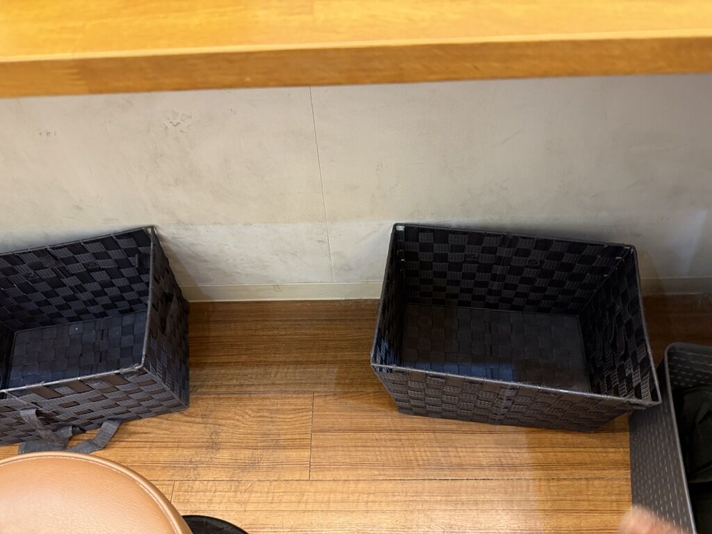 紙エプロンは外の券売機横に用意。足元に荷物かご配備済み。