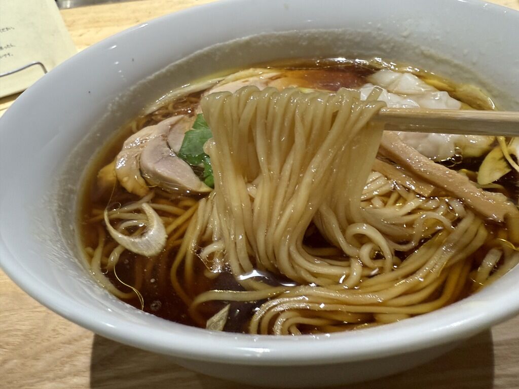 スープはさらさらの無化調清湯醤油味。宮崎県西都市の自社養鶏場で育てた地鶏と水だけの鶏水スープ。8種類の醤油を合わせ低温で火入れをしたカエシ。鶏のうま味が高濃度でキレッキレの味わい。鶏油も上品で上質。タレ由来でしょうか、炭火の香りと焼き鳥のタレの味がしました。見た限り誰も書いていないのが不思議なほど鮮明にタレ焼き鳥味のスープです。十分旨いですが、伸びしろは十分あってまだまだ美味しくなりそうなそんな感じです。