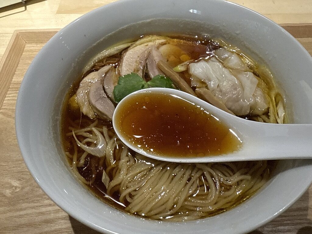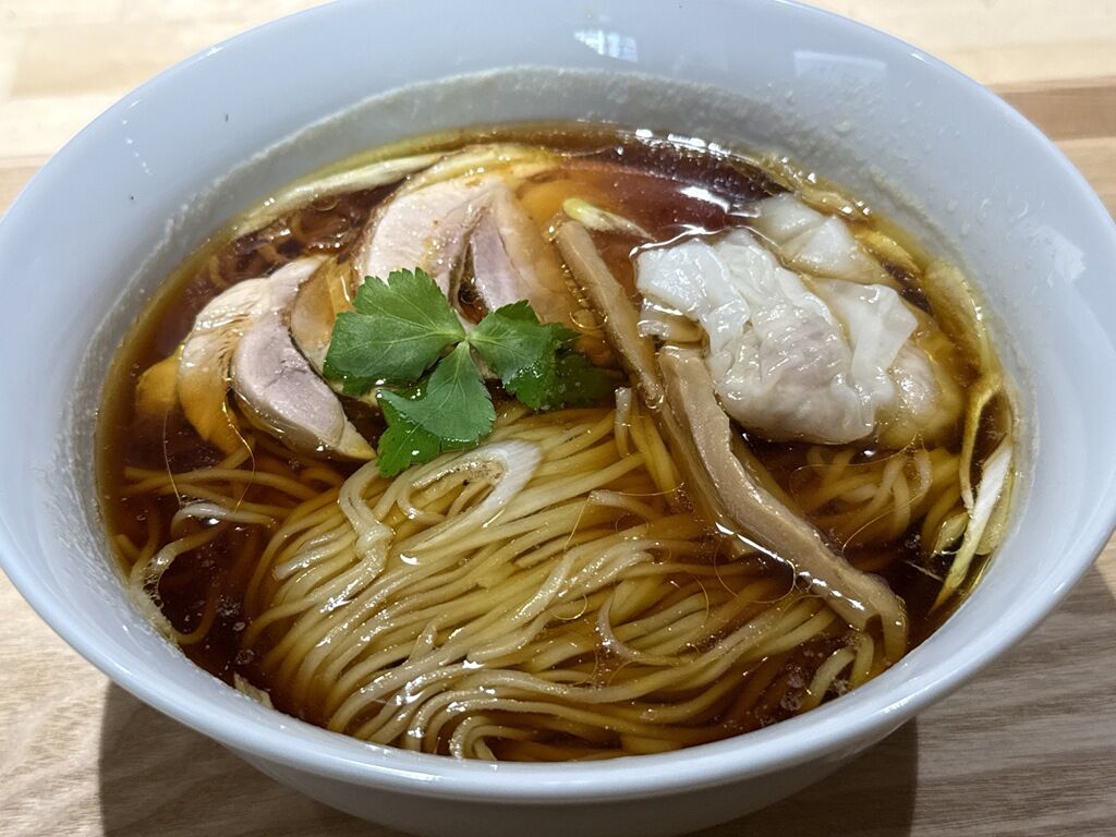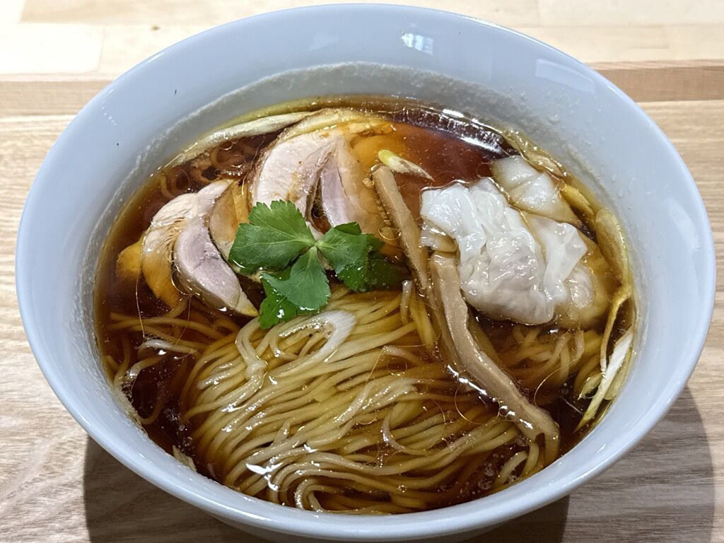 具は地鶏のチャーシュー、ワンタン2個、1週間かけて仕込むめんま、三つ葉、笹切りねぎ。チャーシューはたまたまか分かりませんが驚くほど非常に硬いもの。また小骨が入ってました。ワンタンは極薄い皮に鶏ミンチの餡で美味。