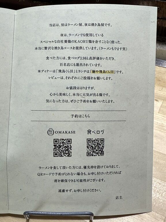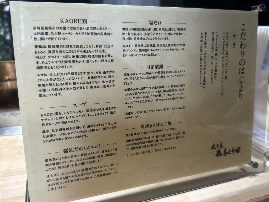 2025年11月18日オープン。多様なジャンルの高級レストランを展開する長谷川稔グループのお店、ディナーコース22,000円+サービス料という高級焼き鳥店「焼き鳥 飛鳥くら田」がランチタイムにラーメンの提供を行う二毛作営業を開始。[スープは自社養鶏場の地鶏と水だけ][国産小麦100%の自家製麺]焼鳥屋の本気のラーメンというこだわりの詰まった一杯を提供。「青森煮干 和渦製麺」の後こちらへ。