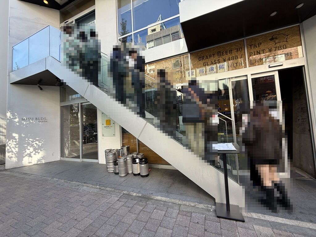 店の場所は神田駅南口徒歩約1分。神田金物通り沿い。ファミマの隣のビル。「CRAFT BEER MARKET」の2F。夜は予約必須ですが、ランチラーメンは列び順。12時開店の20分前到着でシャッター待ちの先客10に接続。店舗は2Fで、2Fへ後1段の所から1Fへ向かって、狭い外階段を1列に列びます。