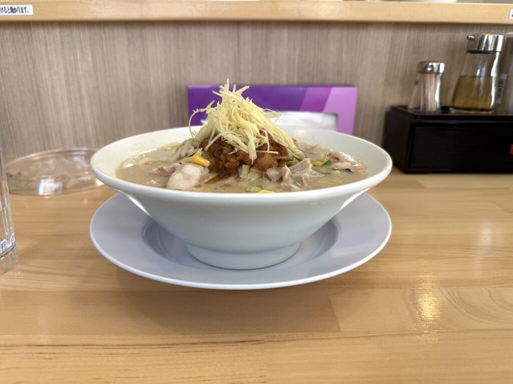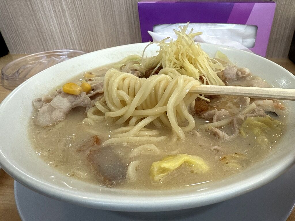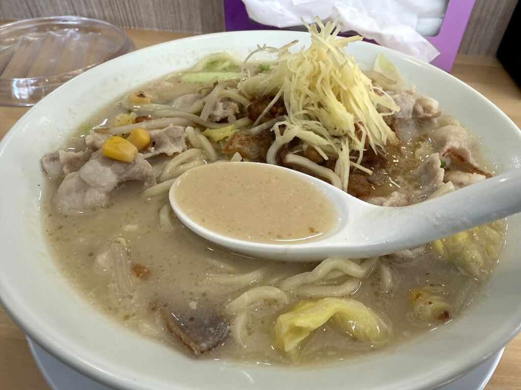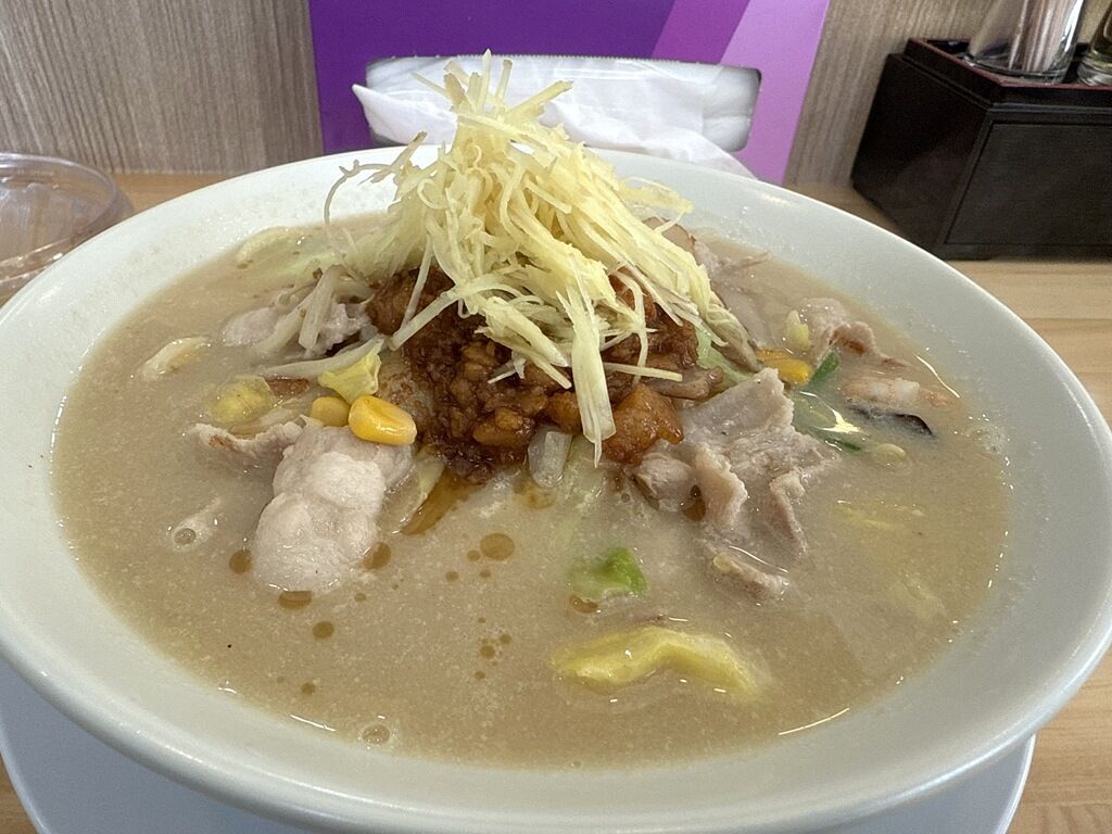 具はちゃんぽんの具として豚肉、キャベツ、モヤシ、コーン、エビ、キクラゲ、ニラ、はんぺん。ちゃんぽんの上に針生姜と味付け背脂。味付け背脂は角ふじや富士丸系、一部の二郎系ではありますが、G系以外のお店では初めてかも。