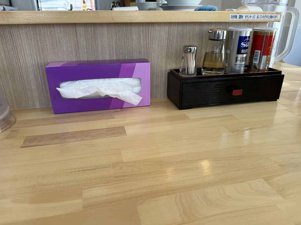 椅子下に荷物かごが用意されています。箸は割り箸。卓上調味料は酢、S&Bブラックペッパー、GS拉麺胡椒。