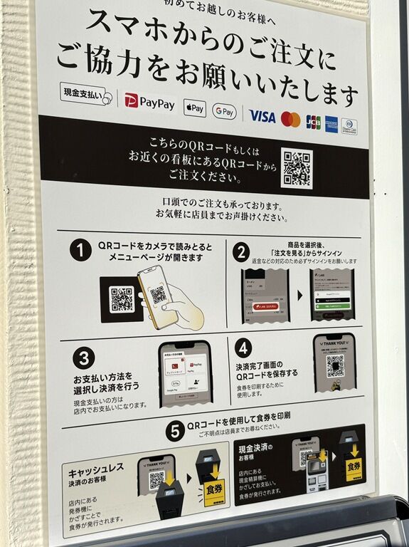 注文は店舗内外掲示のポスターから商品毎のQRコードを読み込み、スマホでキャッシュレス決済まで可能。またはポスターのQRコードを読み取って現金決済を選ぶと現金払いにも対応。どちらにしても注文品決定・キャッシュレス決済完了or現金支払選択まで行うと、スマホにQRコードが表示されます。そのQRコードを現金払い用またはキャッシュレス用発券機にかざすと、食券が出てくる仕組み。初めてだと戸惑いますが、親切に教えていただけます。