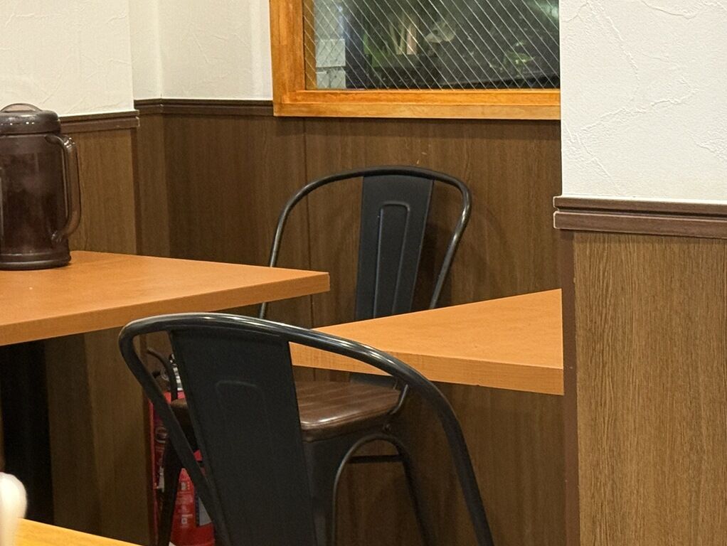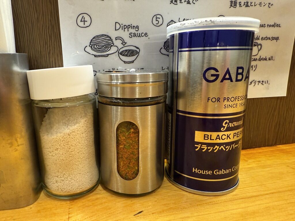 BGMはヒーリングミュージック。箸は割り箸。卓上調味料は白胡椒、七味唐辛子、GABANブラックペッパー。