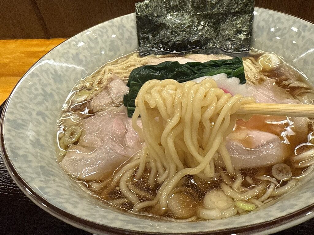 スープはさらさらの清湯醤油味。鶏ベースの雑味のない綺麗な出汁に、生姜が穏やかに効いてスッキリとしつつ深みのある味わい。個人的にはもっとガッツリ生姜を利かせた方が戦闘力が上がると思いますが、今のちょうど良いチューニングが、リピしたくなる絶妙な加減かもしれません。兎にも角にも食べやすくて、スルスルイけちゃいます。さすがのクオリティでとても美味しい!