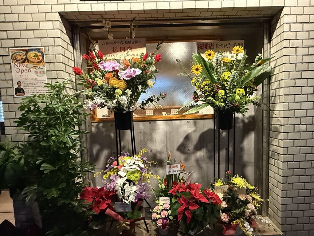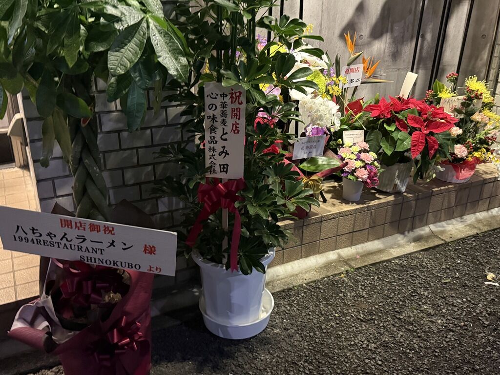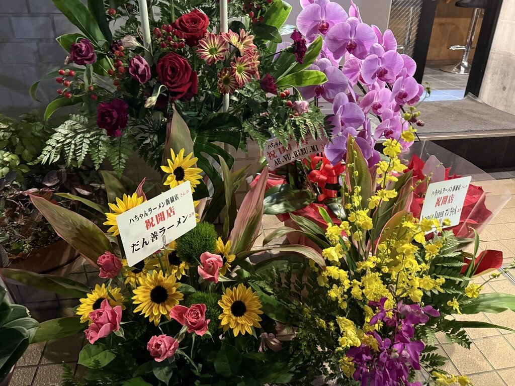 店頭開店祝花は、中華蕎麦とみ田・心の味食品、讃岐うどんいわい・いわい製麺、JAPANESE RAMEN マンちゃん、だん善ラーメン、他から。