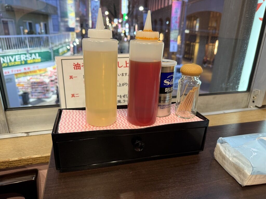 箸は割り箸。卓上調味料は酢、ラー油、S&Bブラックペッパー。