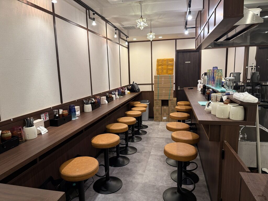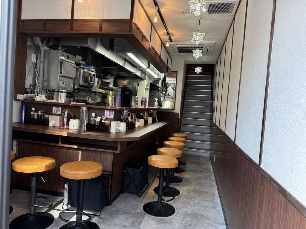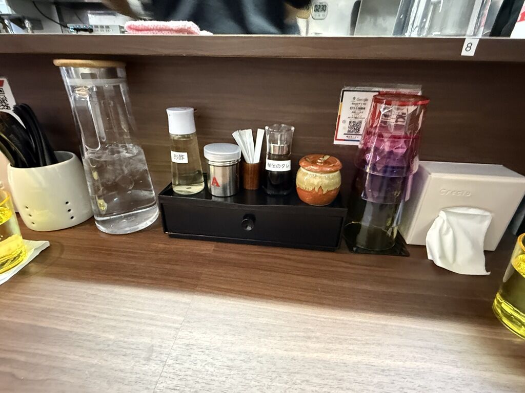 カウンターの奥行きが狭く、カスターセットが大きめなのと後述のラーメン丼が大きいため、器がカウンターからはみ出しそうで、不安泰な感じがしてやや食べづらいです。席後ろの通路は余裕があるので、カウンターをもっと広く取れば食べやすいのですが。