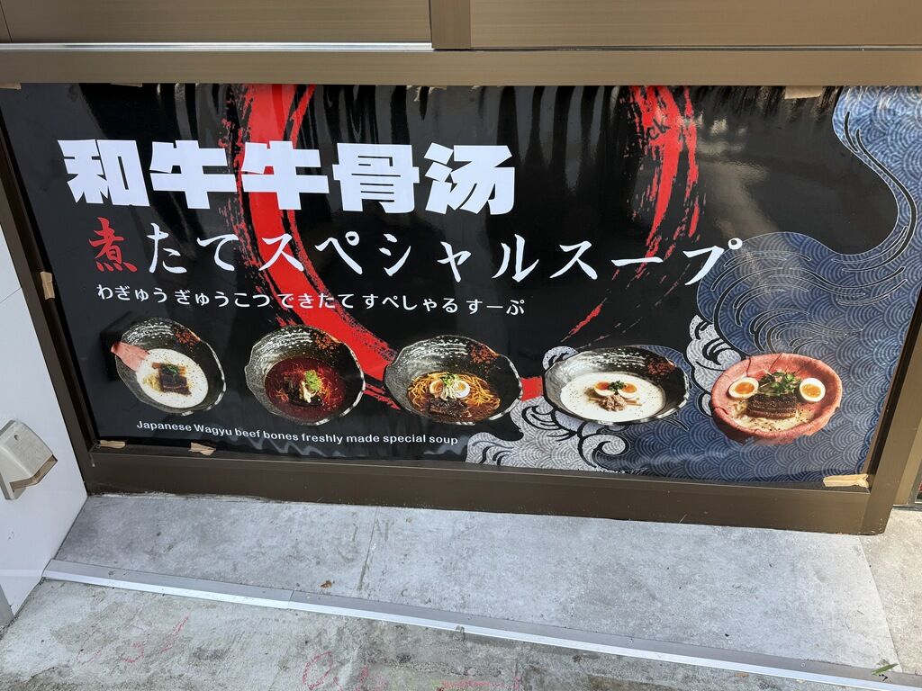 和牛の牛骨ラーメン専門店。オープンイベントとして、11時〜と17時〜、先着50名通常1280円のラーメンを無料で提供、50名以降は500円で販売。口開けに列んでみた。