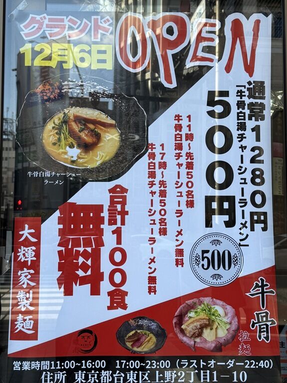 2025年12月6日一粒万倍日、本日オープンの新店「磯川ラーメン(牛骨拉麺 磯川)」へ。