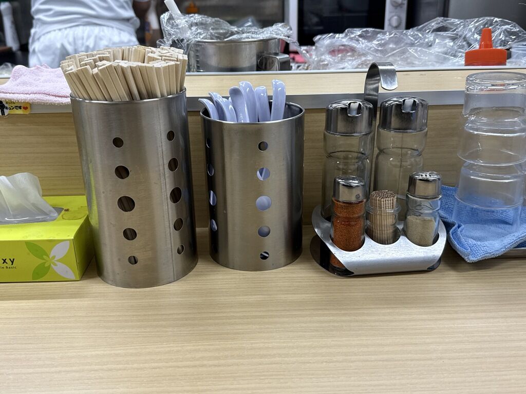BGMはJ-POP、廻廻奇譚、他♪箸は割り箸。卓上調味料は醤油、酢、白胡椒、一味唐辛子。