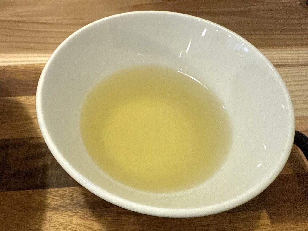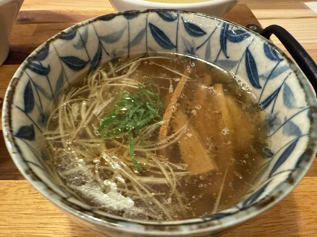 つけ汁はさらさらの無化調清湯塩味。鶏ベースと思われますが、後半にかけて魚介の旨みが強まり、次第に味が変わる楽しい仕掛け。