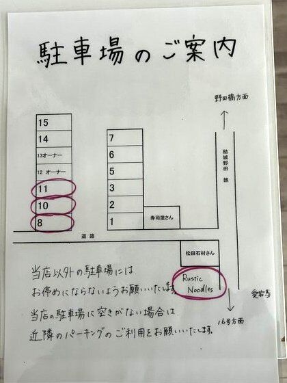 駐車場は、店舗向かって右側の細い路地入った先、右手の契約駐車場8番・10番・11番3台分。駐車場の案内図は公式から借用しました。