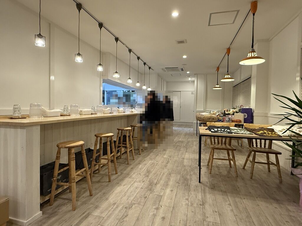 店内は厨房前に真っ直ぐなカウンター8席(4・間・4)、4人卓x3、待ち椅子4脚。4人卓のうち1卓はお祝い品置き場、もう1卓はTシャツが展示されていて、席としては未解放。