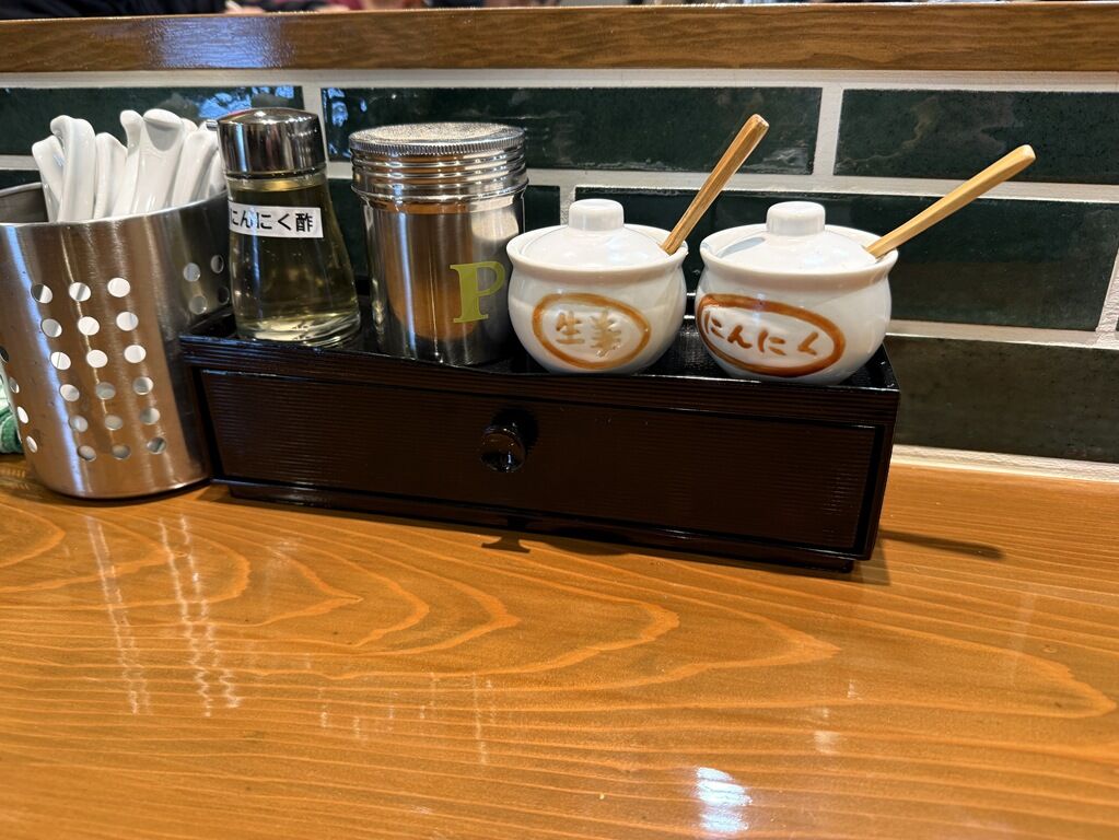 BGMはボサノバ。箸は割り箸。卓上調味料はニンニク酢、白胡椒、おろし生姜、おろしニンニク。