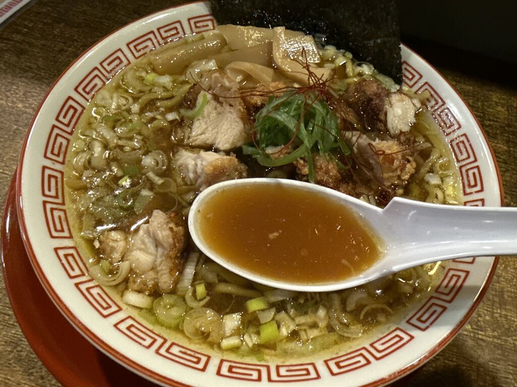 スープはさらさらの清湯醤油味。揚げたてザンギの高熱の油が溶け出して、スープも麺も火傷注意の驚くほど高温熱々。注意しないとあ゛ぢーってなります。動物性ベースにほんのり魚介で「まるえ中華そば」にちょい似の味わい。ザンギの油とエキスが鶏唐揚げの旨みをプラス。元より絶品スープにザンギのシナジー効果でさらにめちゃくちゃ美味しい!
