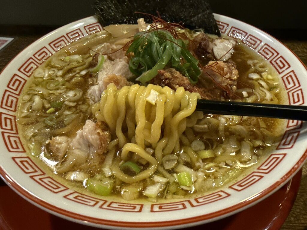 麺は菅野製麺所製の手もみ風中太縮れタイプ。もちもち食感の麺とザンギを一緒に頬張ると至福です。