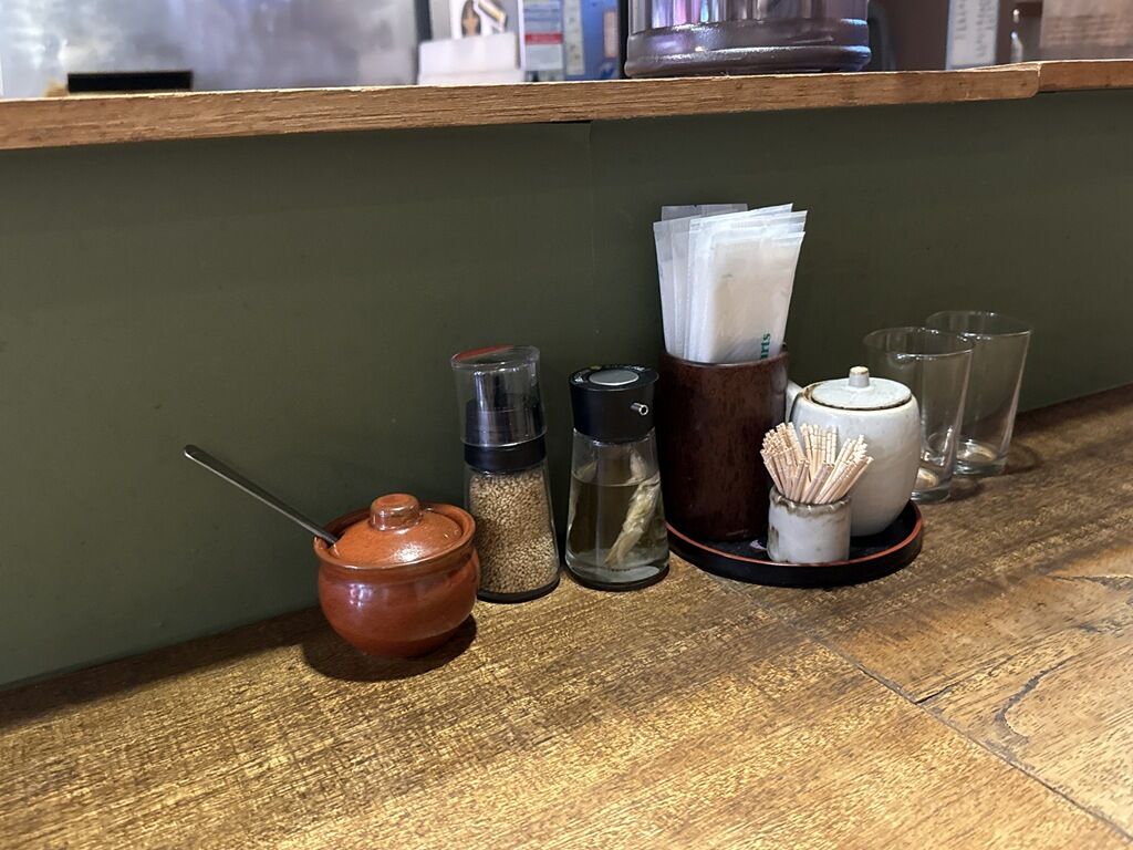 箸は洗い箸でサスティナブルに配慮。卓上調味料は醤油、煮干酢、ラー油、胡麻。カウンター上に一味唐辛子。