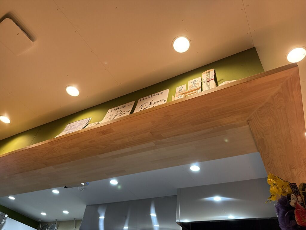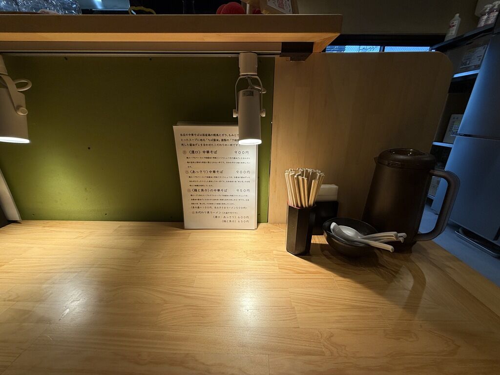 BGMはJ-POP、FAMILY、他♪箸は割り箸。卓上調味料は無し。ラーメンのビジュアルが映える様に、各席に手元を照らすスポットライトが設置されています。