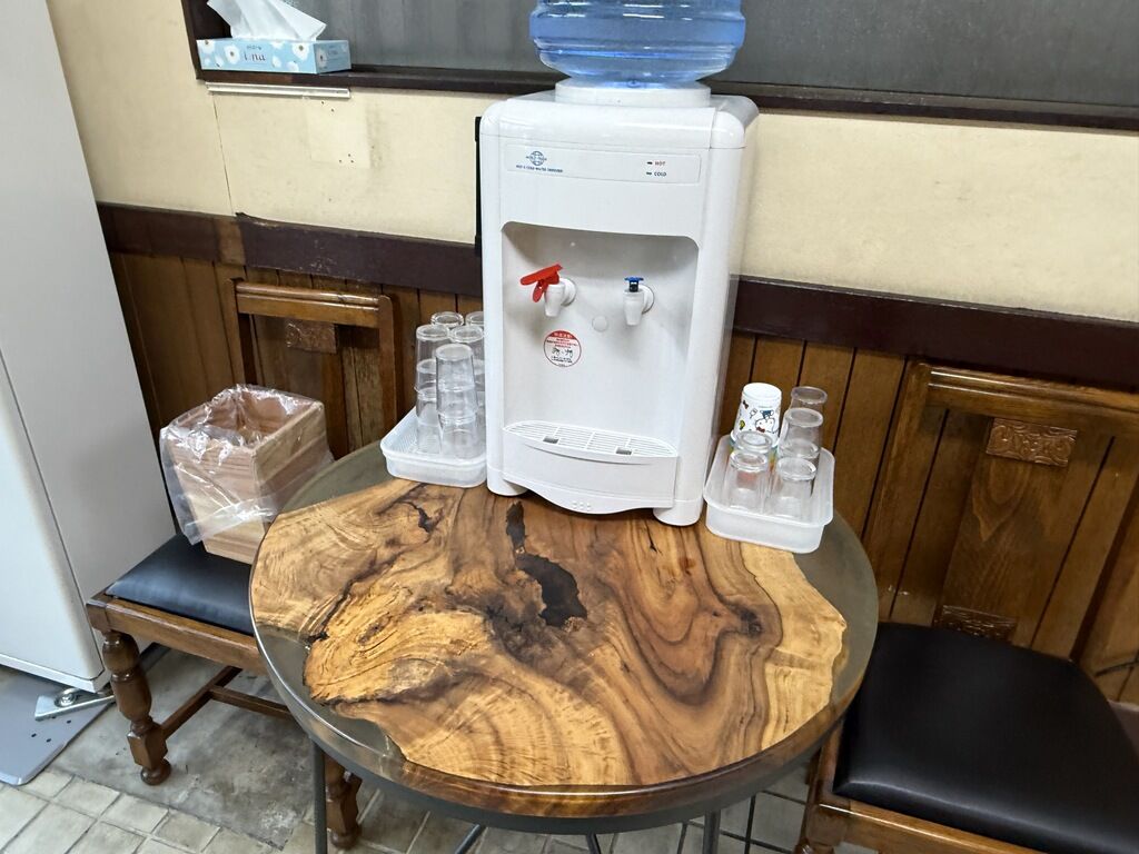 当初カウンターにあったウォーターサーバを券売機横に移設、その台となる机は師匠のコレクションの一つだそうです。巨大な切り株を加工したもので、味覚だけではなく視覚までも本物に触れて高めて欲しいという師匠の意図とか。