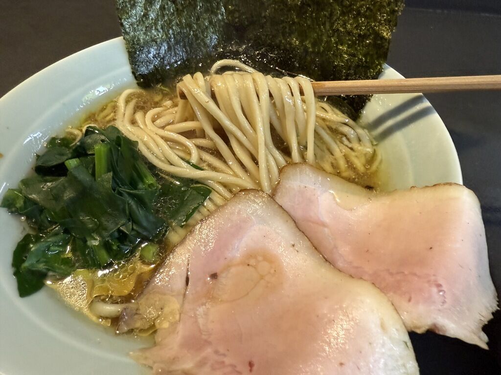 スープは非乳化のさらりとした鶏豚骨醤油味。白楽「NATURAL TASTE」の濃い豚骨スープともまったく異なりますね。鶏油の香りが香ばしいです。醤油タレを立たせず鶏豚スープの旨みを前面に出す構成。さらっと軽い口当たりですが、無化調無添と信じられないほどしっかりとした肉と骨と髄の旨みがあります。直系とも最新型超濃厚家系とも鶏だけの家系とも異なるオリジナルな(邪道な!?)味わいで、これは美味しい!