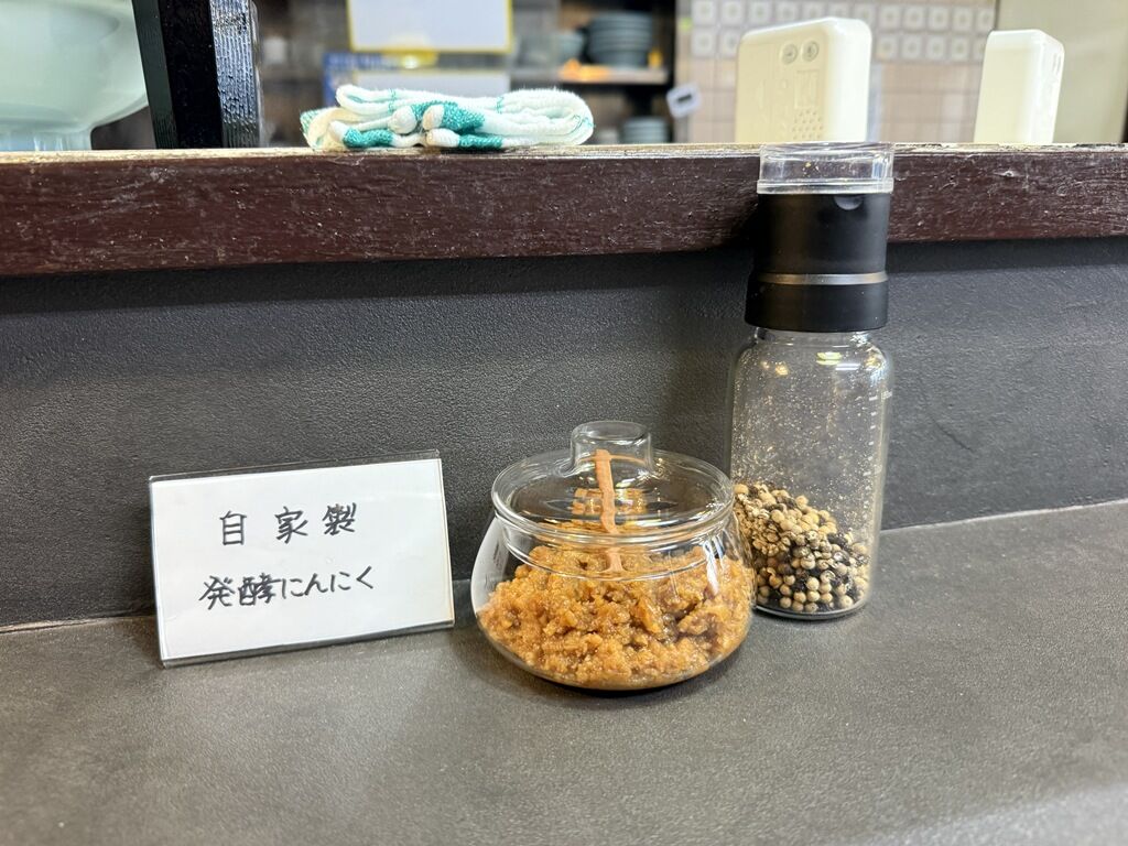 BGMはヒップホップ。箸は割り箸。卓上調味料は自家製発酵にんにく、ミル入りブラックペッパー。