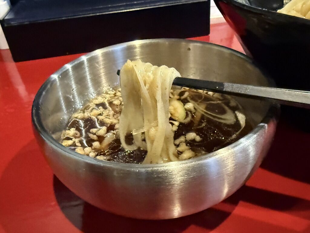 つけ汁はさらさらの清湯醤油味。醤油タレがキリッと立って魚介の効いた和風のつけ汁に揚げ玉で油のコクと食感をプラス。