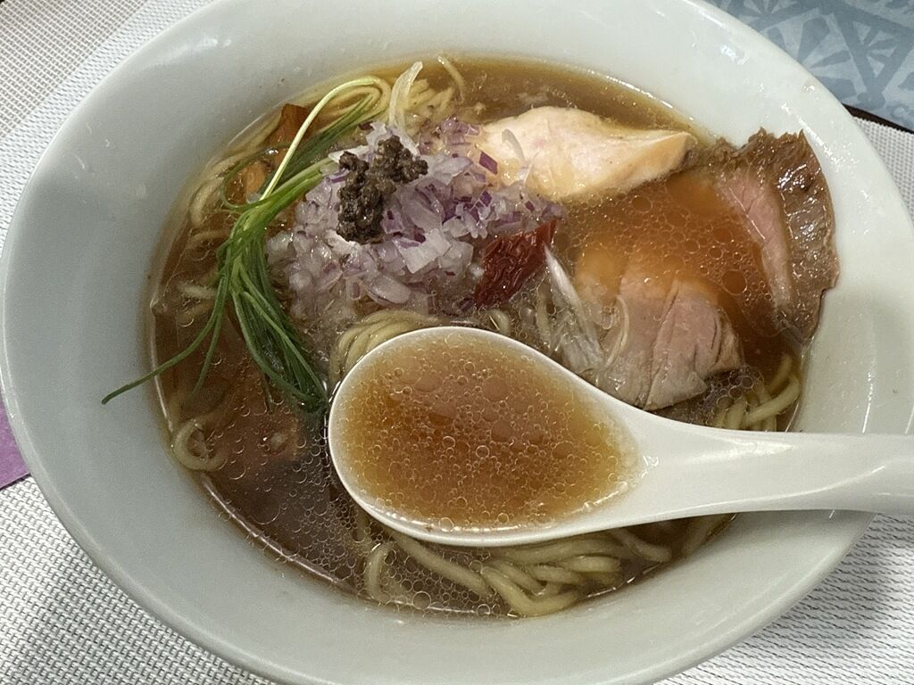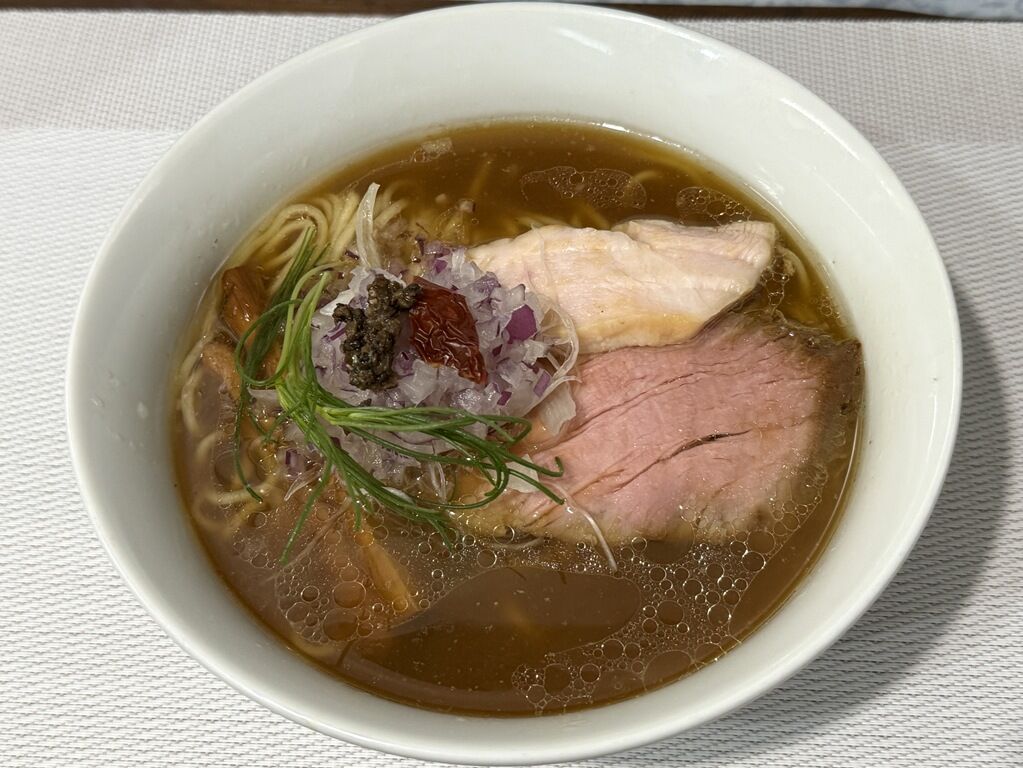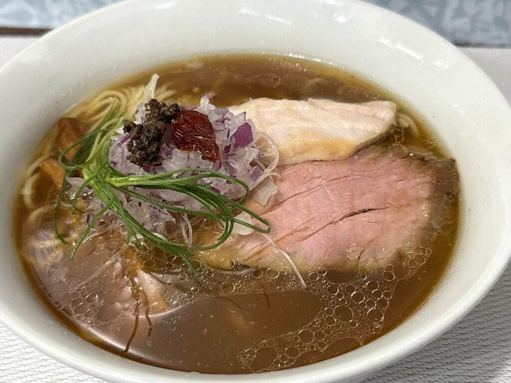 具は低温調理の豚ロース・鶏ムネのチャーシュー2種、ポルチーニ・トリュフペースト、芽ねぎ、ドライトマト、きざみ紫玉ねぎ。