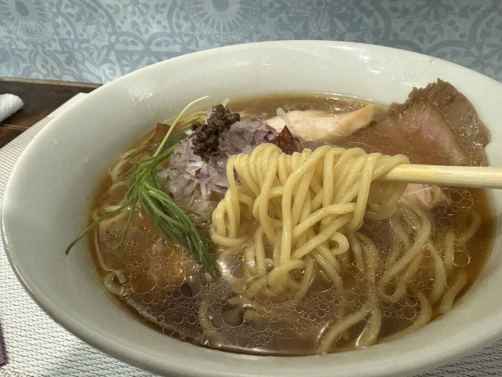 麺はほぼストレート中太タイプ。オープン当初浅草開化楼製でしたが、2022年11月時点でエヌアールフード(支那そばや)製の麺を使用。当時と変わっていなければ支那そばや謹製麺と推察。柔らかめなゆで加減で、しなやかな麺が楚々としたスープと良くマッチ。