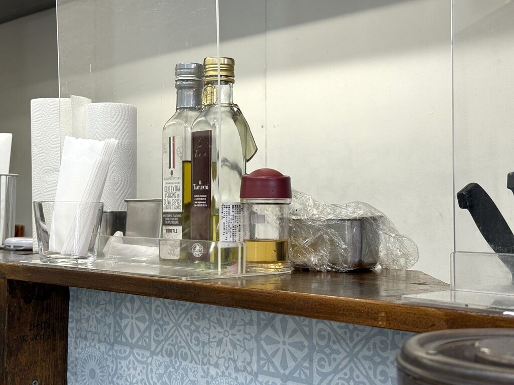 BGMは無し。箸は割り箸。卓上調味料は酢、ミル入りミックスペッパー。