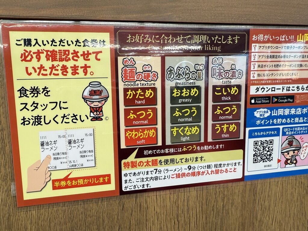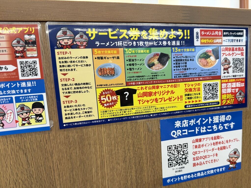 「山岡家」はラーメン1杯につき券売機からサービス券1枚出る方式。これは22年前もそうだった記憶。サービス券を集めるといろいろ特典があります。リピータには嬉しい仕組み。