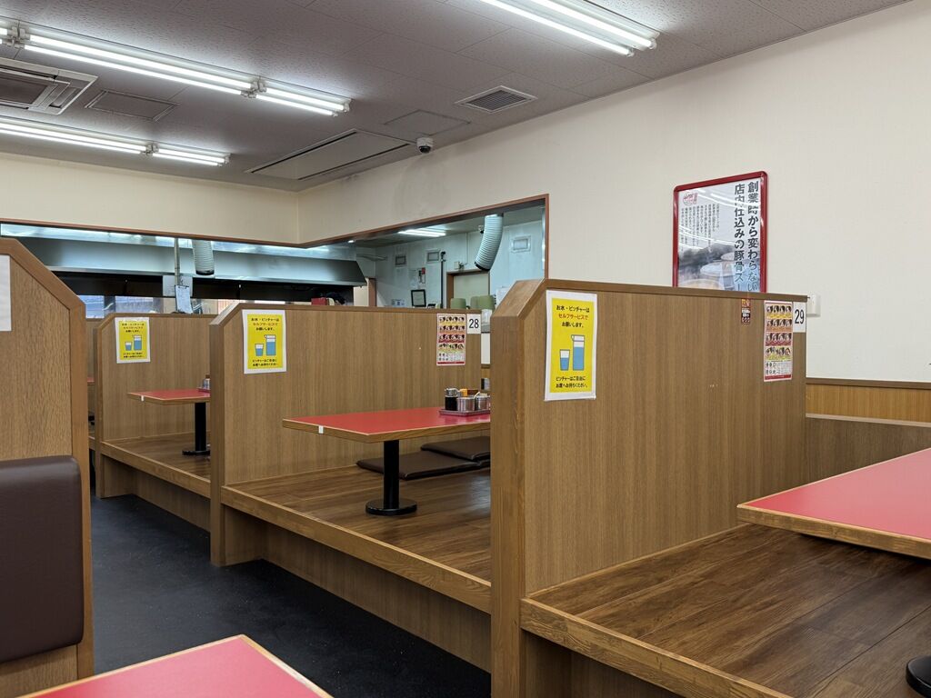 「山岡家 春日部店」の席はカウンター19席、BOX席6人卓x8、小上がり6人テーブルx4。店内は豚骨の発酵臭が充満していて、最初はちょっと引くくらい臭いです。