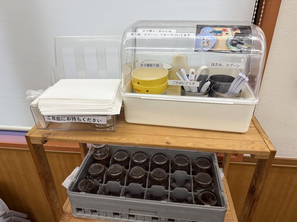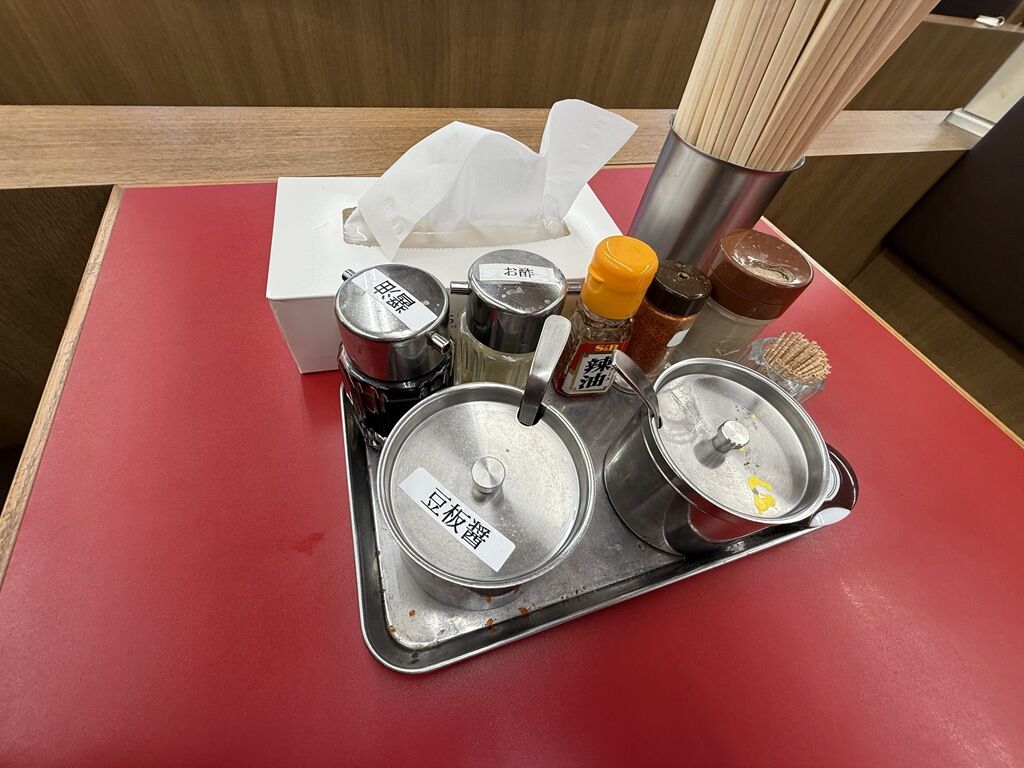 BGMはJ-POP。箸は割り箸。卓上調味料は豆板醤、醤油、酢、S&B辣油、一味唐辛子、白胡椒、おろしニンニク、豆板醤。