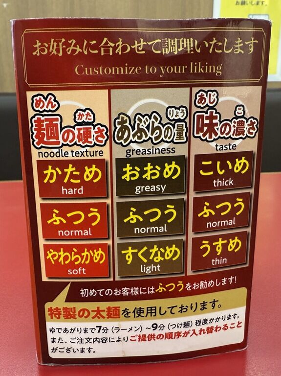 食券を渡すと家系風のお好み(麺の固さ・味の濃さ・油の量)を聞かれます。