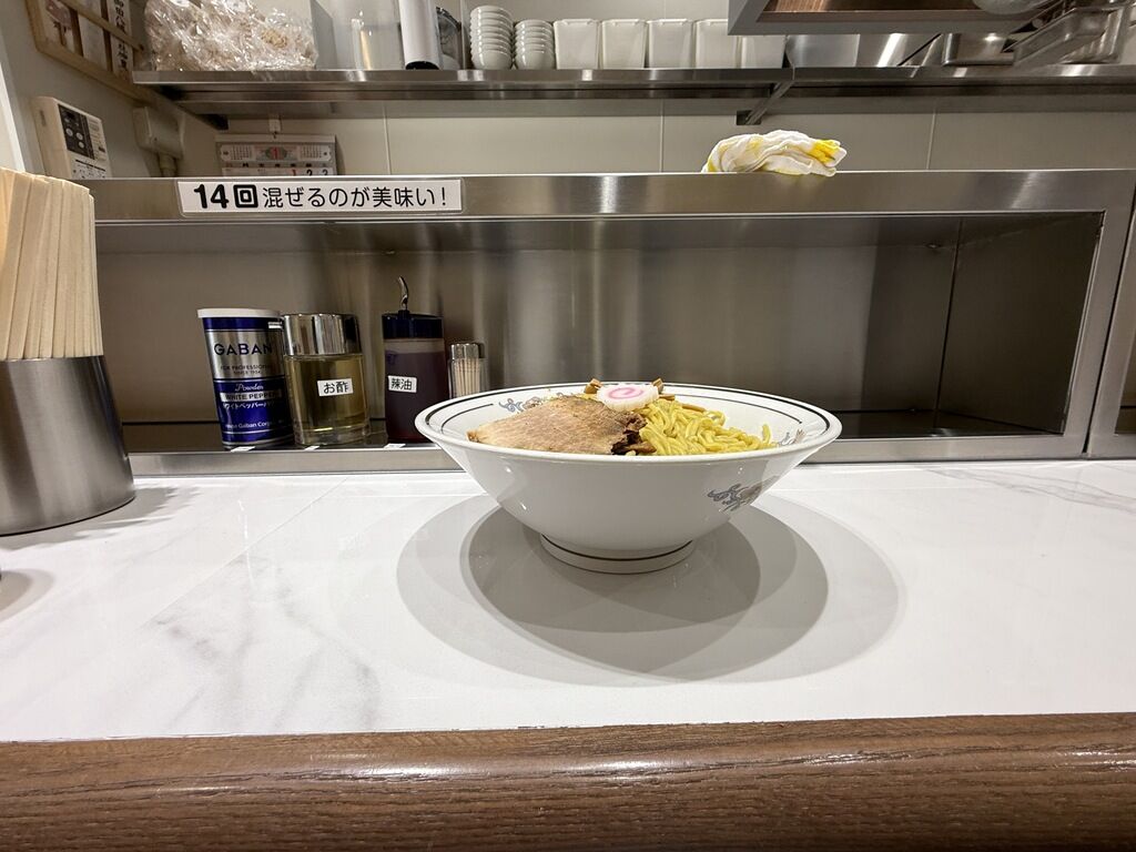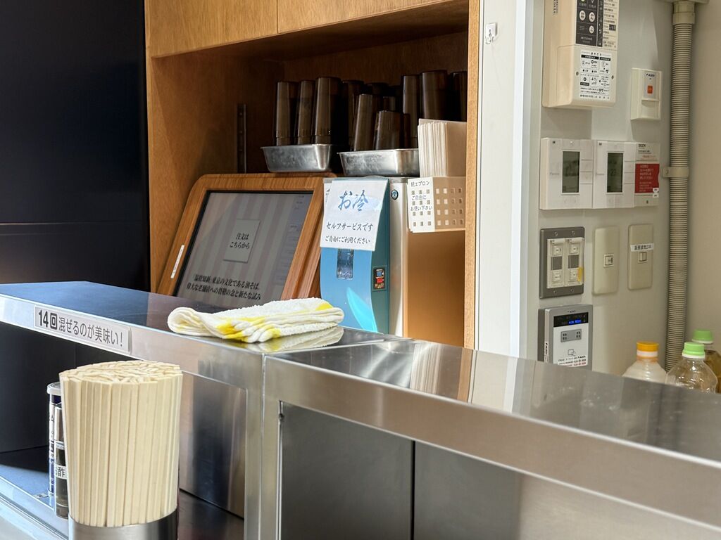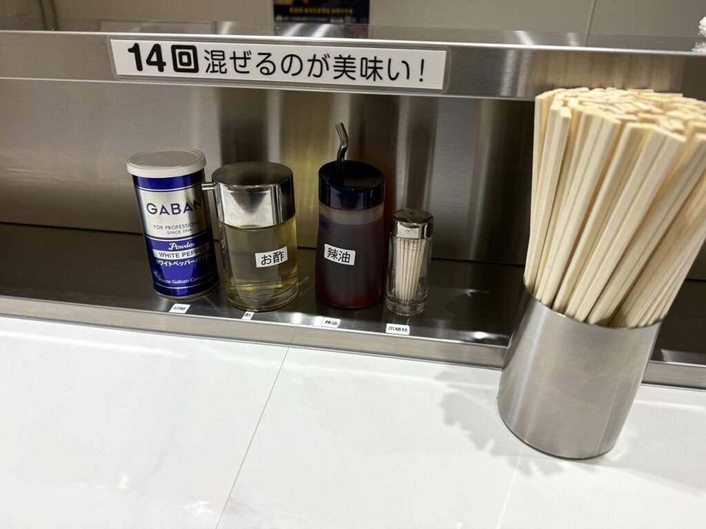 BGMはクラシック。落ち着いた優雅で典雅なクラシックを聴きながら、立ち食いで油そばを食べる空間。箸は割り箸。卓上調味料はGABANホワイトペッパー、酢、辣油。カウンターには「14回混ぜるのが美味い!」と掲示。