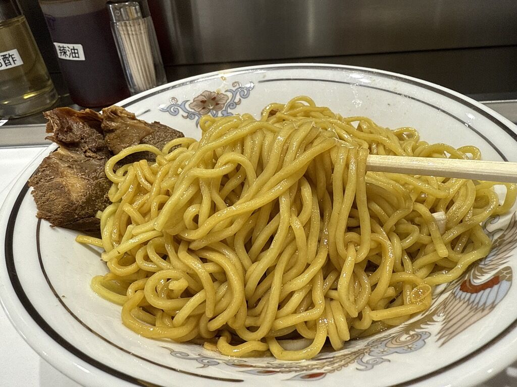 器の底には多めの醤油ダレ。全体をしっかり混ぜていただきます。味は、プレーンでオーソドックス、シンプルでトラディショナル、ノスでレトロな油そば。580円なら十分過ぎるクオリティ。チャーシューもデカくて食べ応えあり。麺量もたっぷりあって十分満たされます。