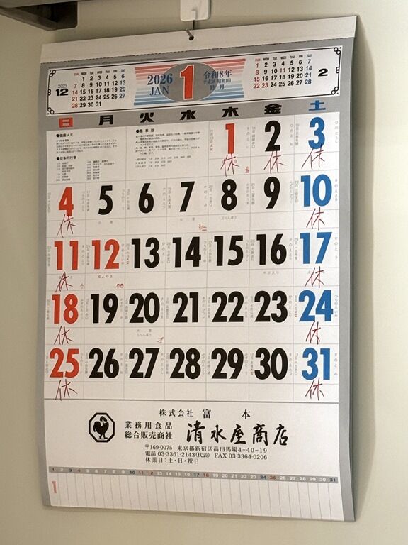 出入口近くに2026年1月の営業カレンダーが掲示されていました。