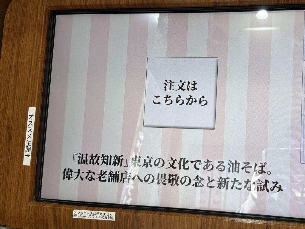 【券売機トップ画面には、『温故知新』東京の文化である油そば。偉大な老舗店への畏敬の念と新たな試み】とああります。