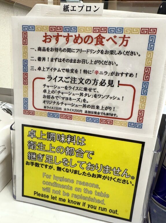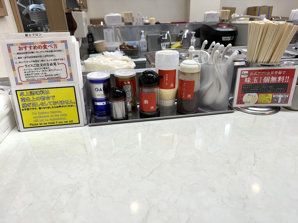 BGMはポップス♪箸は割り箸。卓上調味料はGABAN一味唐辛子、GSラーメンコショー、酢、マヨネーズ、チャーシュー丼たれ。