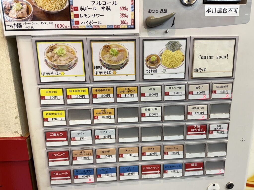 訪店時「油そば」は準備中。券売機に「本日連食不可」の掲示。後のお客さんで麺固めの注文が通ってました。