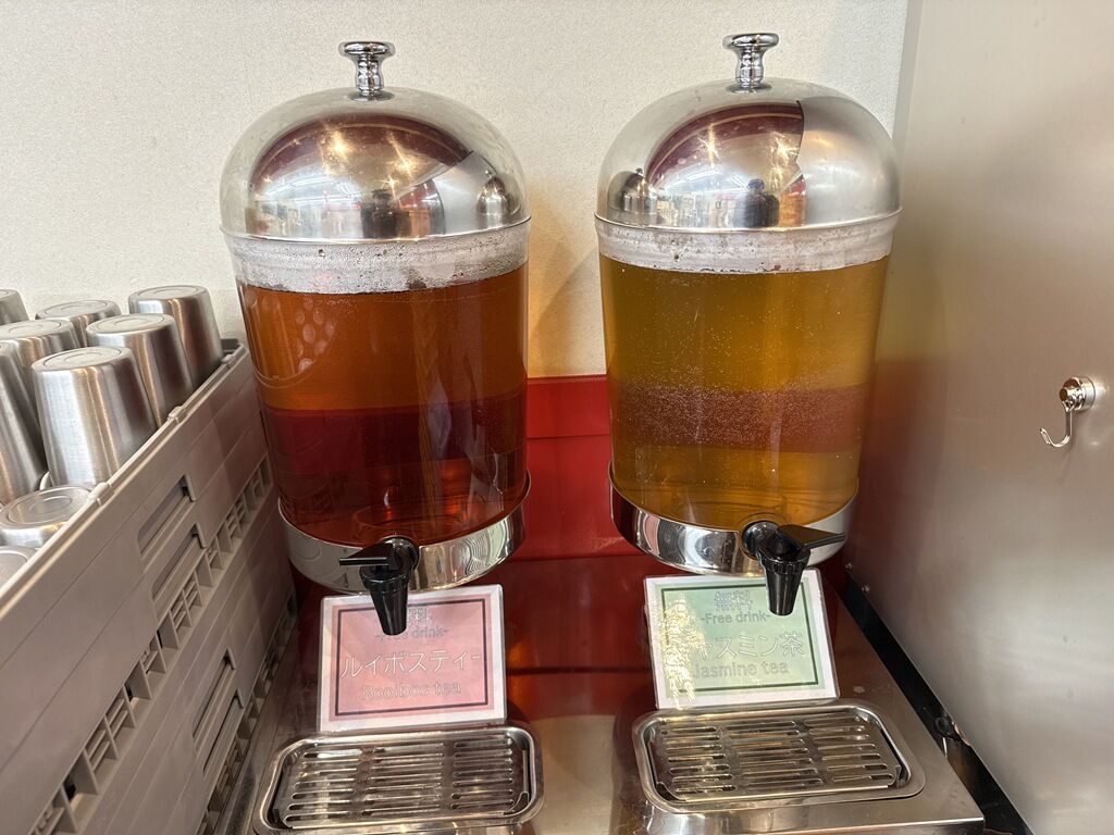 お冷やはセルフで通常の冷水の他に無料で、ルイボスティー、ジャスミン茶から選択可能。ただ、ジャスミン茶は常温でした。