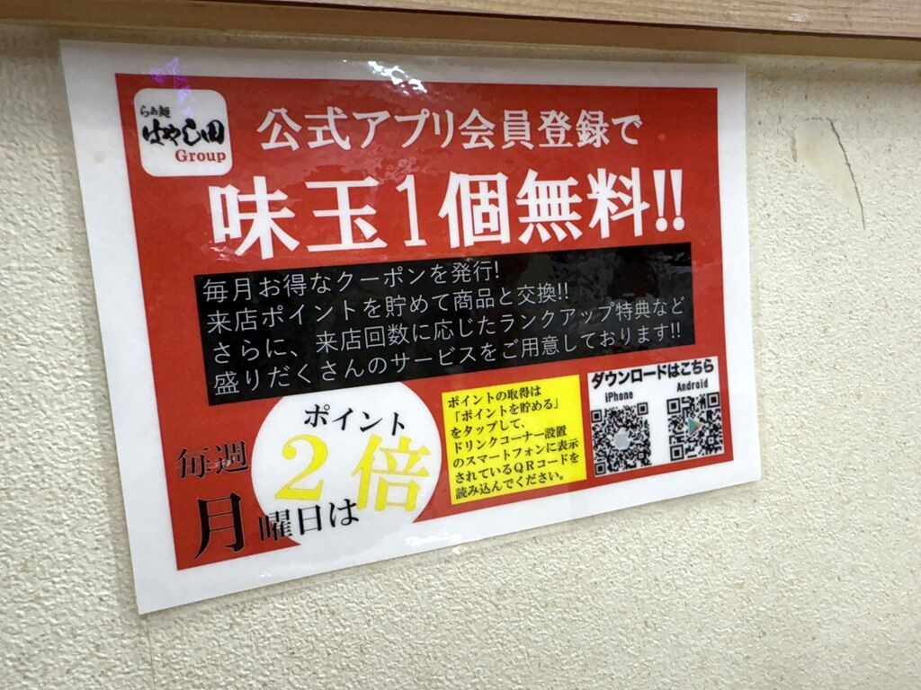 公式アプリ会員登録で味玉1個無料。
