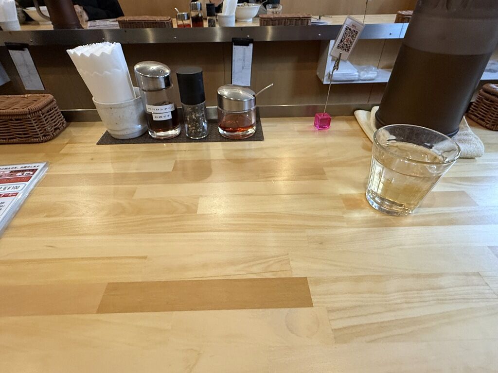 Boseのスピーカーから流れるBGMはジャズ。箸は洗い箸でサスティナブルに配慮。卓上調味料はペペロンチーニ、ミル入りブラックペッパー、ラー油。
