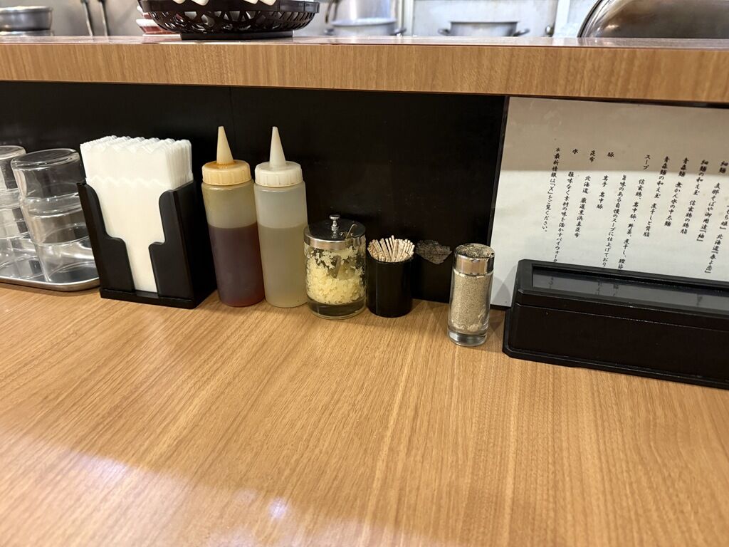 BGMはポップス。箸は洗い箸でサスティナブルに配慮。卓上調味料はラー油、酢、にんにく、白胡椒。