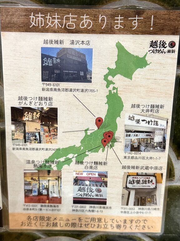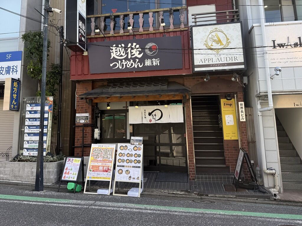 2025年12月5日オープン。「越後つけめん維新」の湯沢本店、湯沢がんぎどおり店、温泉つけめん維新熱海本店、大井町店、武蔵中原店に次ぐ支店。運営は㈱テンポスホールディングス傘下の㈱サンライズサービス。そういえば「つけめん維新」系列に行ったことがなかったって気づいて、行ってみようかと「元祖焼豚センター うる寅商店」の後こちらへ。