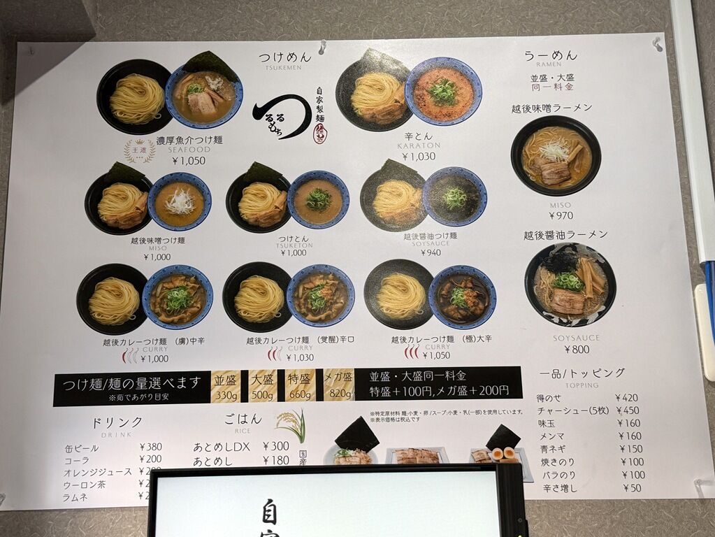 つけ麺は並盛200g・大盛200g同料金、特盛400g+100円、メガ盛500g+200円。