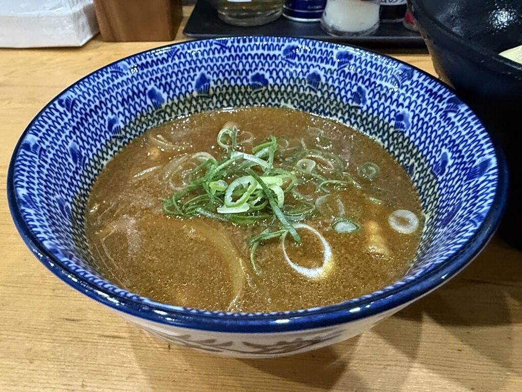 つけ汁はとろっとクリーミーな豚骨カレー味。ベースのスープは、ゲンコツとモミジを高温高圧(136℃の温度で3気圧の圧力)で炊いたコラーゲンたっぷりの濃厚豚骨スープ。中辛はほんのちょっぴりピリ辛レベル。